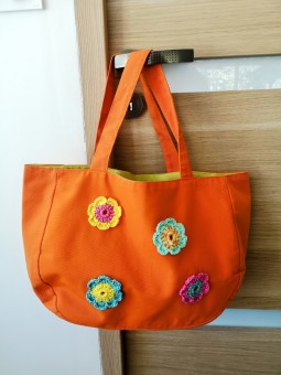 Aux couleurs d'été, ce sac fait à la main orné de jolies fleurs en crochet de chaque côté du sac. Cet accessoire est parfait pour la saison printemps/été. Avec ce sac réversible, vous n'aurez pas le temps de vous lasser. Si vous êtes une adepte du "fait mains" et du travail artisanal, ce sac unique vous comblera !